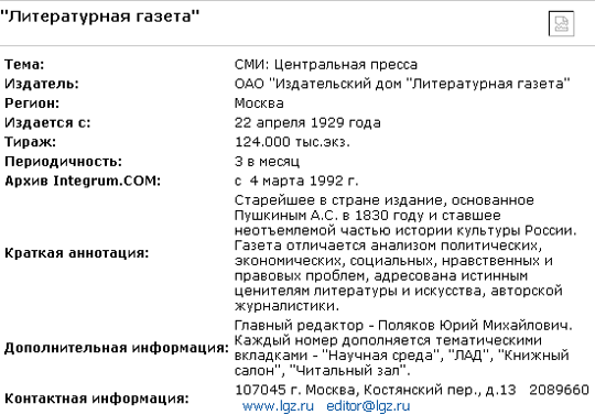 For example, a researcher can track all the editions which cover such topics as "culture", "education" and "enlightenment" and get the necessary data on the edition: circulation, periodicity, the date of its first archive in the Integrum databases, brief annotation, contact information and references to other materials of the publisher, kept in Integrum.