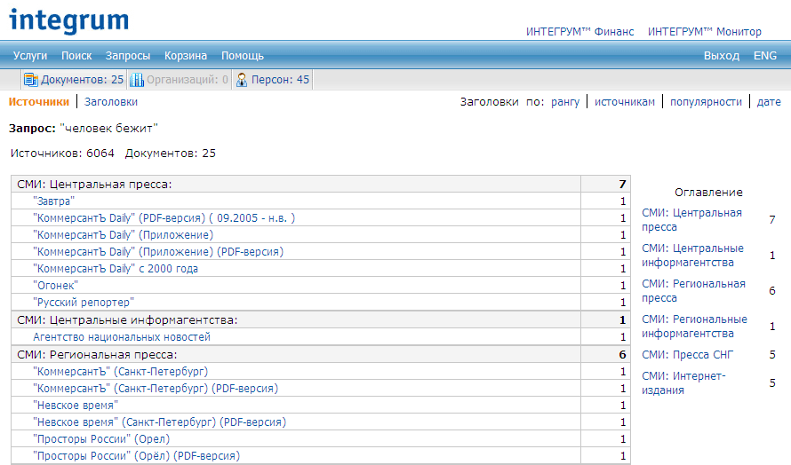 После запуска поиска кнопкой ИСКАТЬ мы получаем по умолчанию один из нескольких видов представления результатов поиска. Он определяется профилем, специальной закладкой на странице ввода запроса. По умолчанию открывается список названий источников, в которых найдены документы.