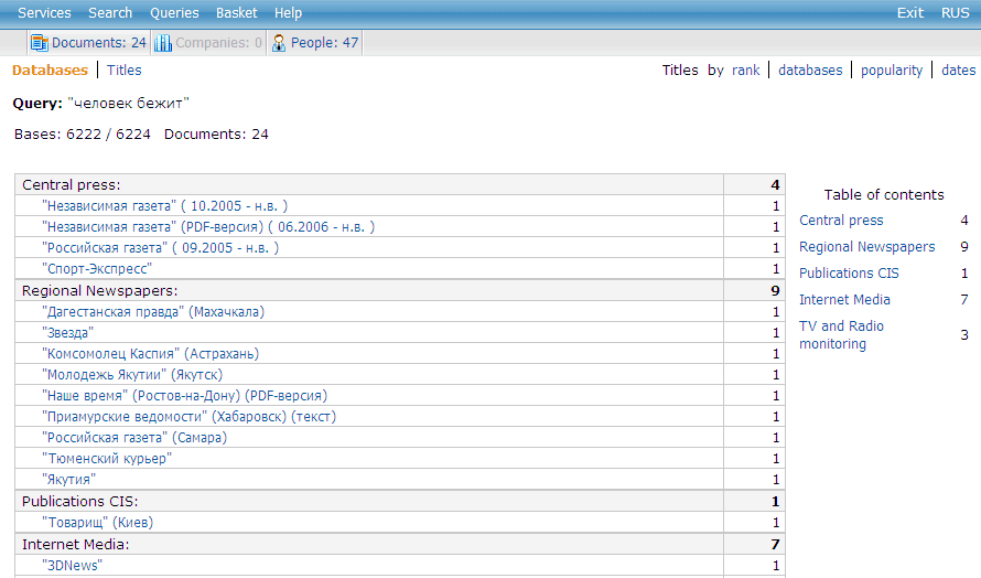 After pressing the button Search we get one of the forms of viewing the search results. It’s defined with the profile , a special tab at a query entry page. A list of databases which contain the retrieved documents is opened on default. On the right of the database name there is a number indicating the number of relevant documents the database contains. Clicking the database name, you can move to the page with fragments of documents found in this database.
