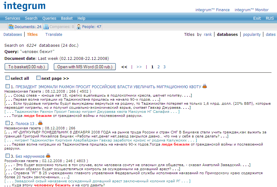 Switching to the tab Titles or pressing the needed source, we will open a page of query results. Here we can see a title and date of creation of each retrieved document, key sentences and key words of a document and a relevant fragment of a document, which enables a user to decide whether he or she is interested in the document, whether it’s worth studying in detail.
